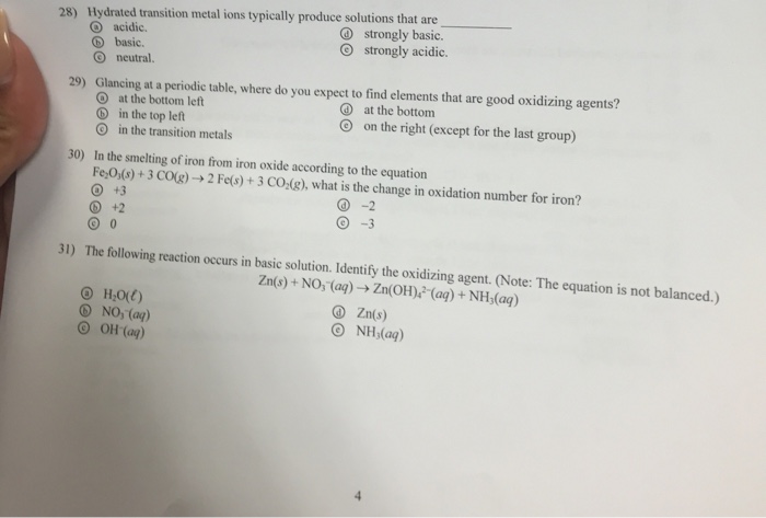 Chemistry questions and answers. Glancing at a periodic table where do you expect to find elements that are good oxidizing agents. Iron III oxide Fe 2 O 3 when hydrated this is rust l copper II compounds are blue e.